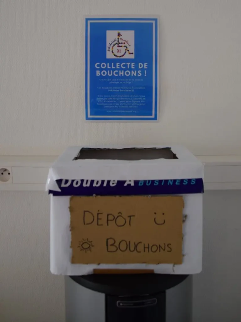 Des boîtes ont été disposées dans l’institut pour récolter des bouchons en plastique. Ces bouchons seront reversés à l’association « Solidarité Bouchons 31 » dans le but de permettre la création de fauteuils roulants en matière recyclée.