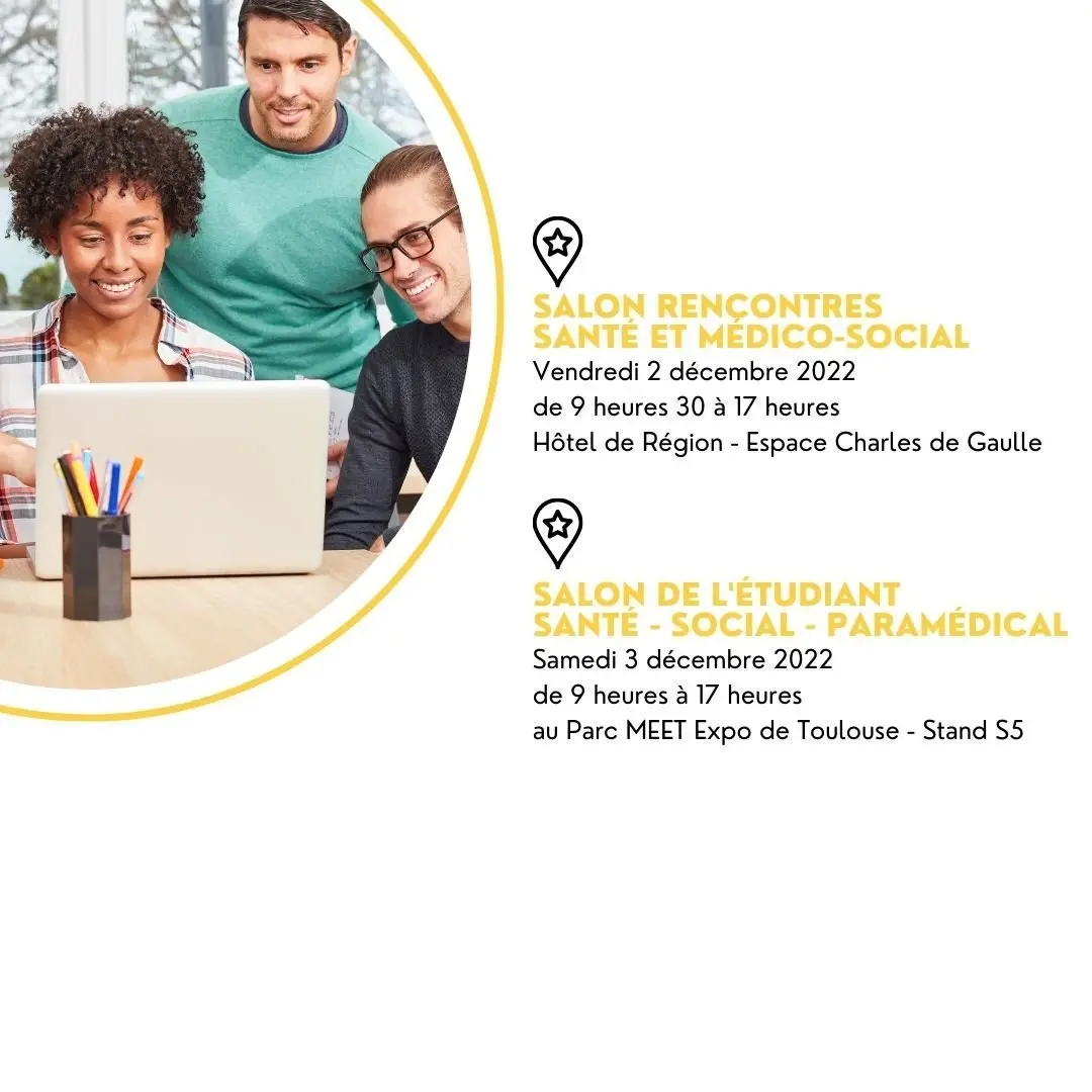 – Salon de « L’Étudiant Santé – Social – Paramédical », le samedi 3 décembre 2022, de 9 heures à 17 heures, au Parc Meet Expo de Toulouse (stand S5).